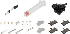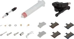 1 x Bremssattel Hope RX4+ FM +20 für Shimano / Campagnolo Hinterrad1 Paar Bremsbeläge Hope blau für Road1 Paar Bremsbeläge Hope rot für Cyclocross / Gravel2 x Befestigungsschraube1 x R-Clip6 x Unterlegscheibe1 x Belaghalteschraube1 x Rückstellfeder1 x Olive1 x Insertpin1 x Überwurfmutter1 x Unterlegscheibe Kupfer1 x Spritze1 x Schlauch mit Adapter2 x Entlüftungsblock