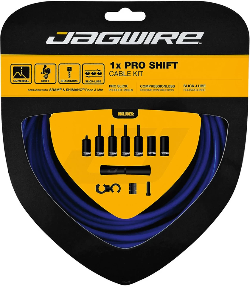 1 x Schaltzug Jagwire Pro Level 2800 mm (HR)1 x Schaltzugaußenhülle Jagwire LEX-SL 2200 mm mit Liner Jagwire Slick-Lube2 x Endkappe Jagwire Aluminium, gedichtet4 x Endkappe Jagwire Aluminium Lined1 x Endkappe Jagwire Aluminium Hooded3 x Rahmenschützer Jagwire Cable Donut1 x Rahmenschützer Jagwire 5G Tube Top1 x Endtülle1 x Rotationshaken Jagwire