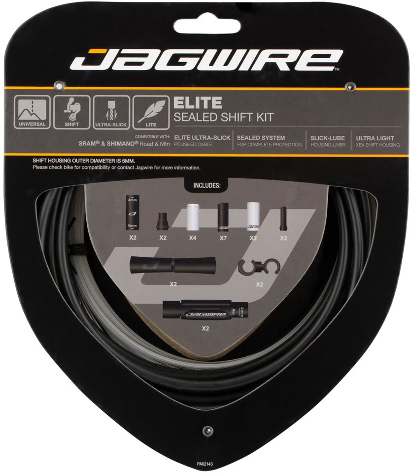 Das Jagwire 2X Elite Sealed Schaltzugset besteht aus polierten Ultra-Slick Zügen auf Elite-Niveau mit Slick-Lube Liner, welcher die Reibung dramatisch reduziert. Die Außenhülle XEX ist deutlich leichter als traditionelle Schaltzugaußenhülle. Dabei ist zu beachten, dass sie über einen Durchmesser von 5 mm verfügt. Das Jagwire Elite Level steht für wettkampftaugliche Produkte auf höchstem Niveau.