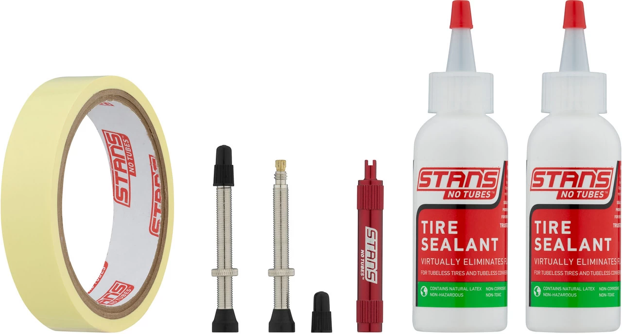 Mit dem Tubeless Kit von NoTubes rüstest Du Dein Rennrad oder Gravel-Bike problemlos auf Tubeless-Reifen um. Es enthält: zwei Ventile, Felgenband und zwei Flaschen mit 59 ml Tire Sealant Dichtmittel.