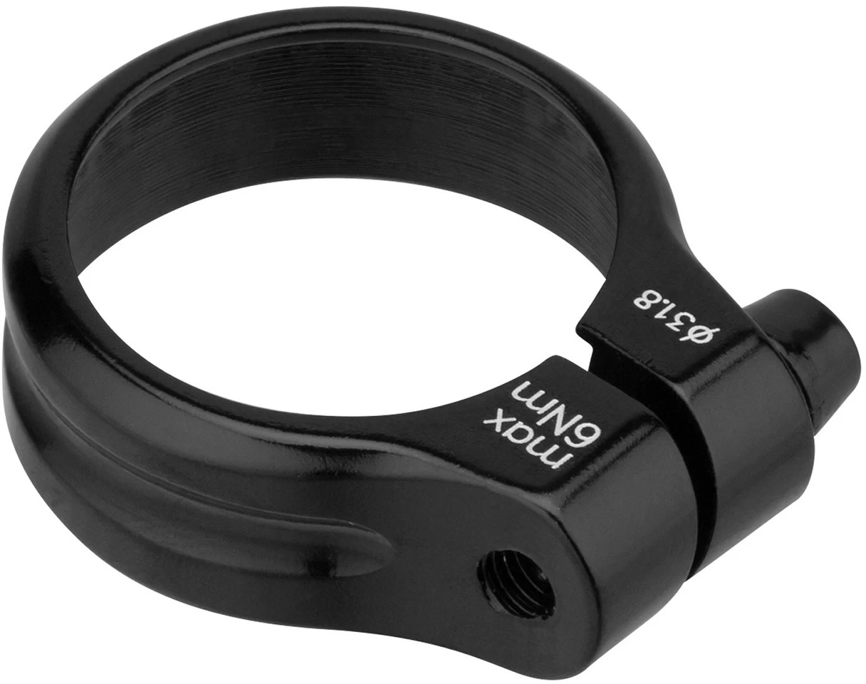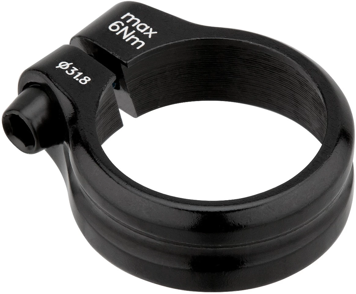 Die Sattelklemme von 3min19sec wird mit einer Innensechskantschraube geklemmt. Sie überzeugt durch ihr schlichtes Design und bringt mit 13 g kaum Mehrgewicht an Dein Rad. Die Klemme besteht aus Aluminium und ist 13 mm hoch. In klassischem Schwarz gehalten, lässt sie sich sowohl für Mountainbikes wie für Rennräder wie für Trekkingbikes verwenden. Du hast die Wahl zwischen einer Ausführung für den Sattelrohr-Durchmesser 31,8 mm und einer Version für 34,9 mm. Ziehe die Schraube mit maximal 6 Nm an.