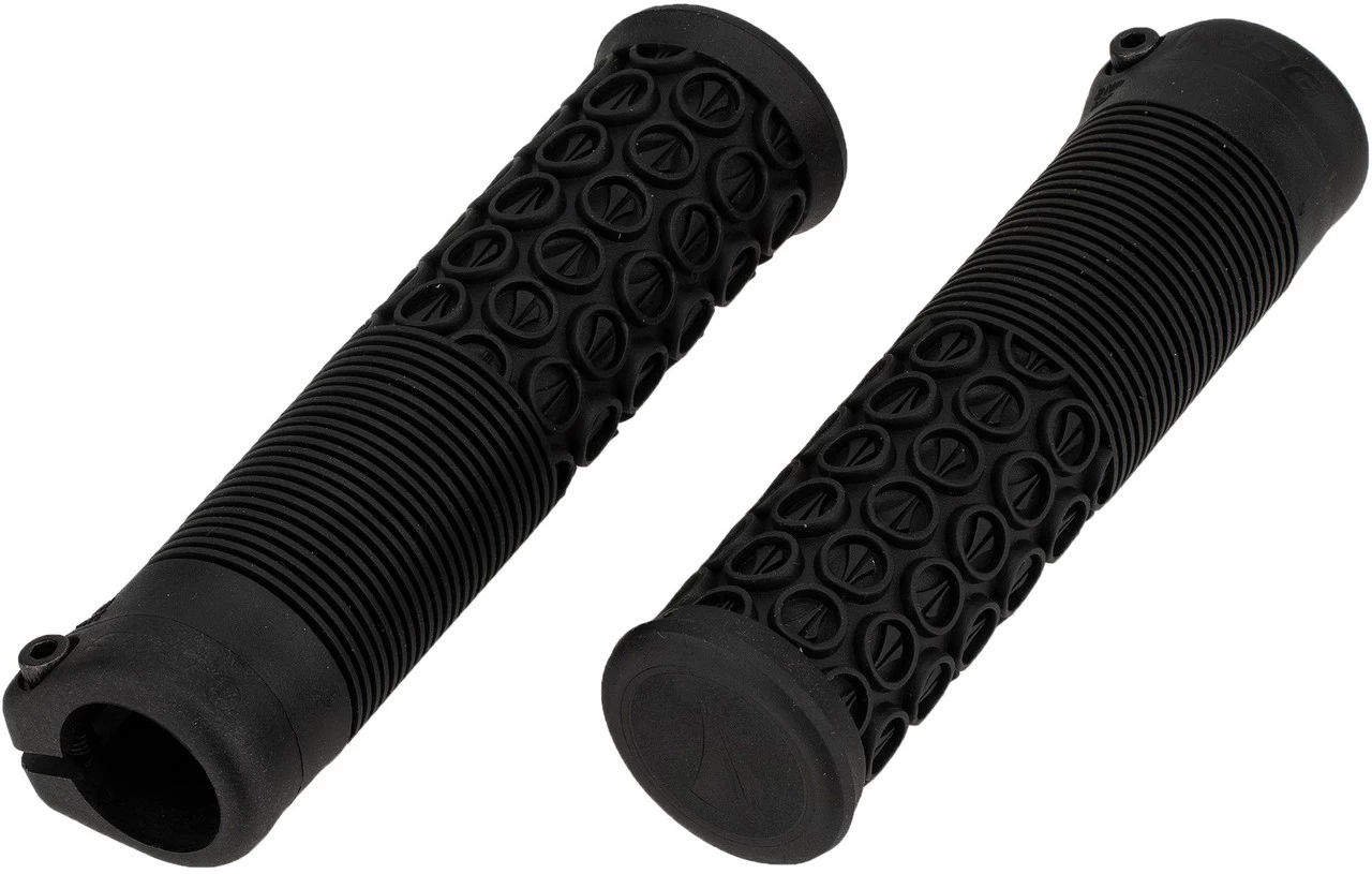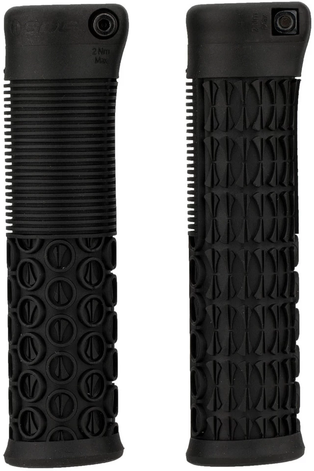 Die SDG Thrice Lock-On Lenkergriffe mit einem Durchmesser von 33 mm besitzen ein ergonomisches Griffmuster mit tiefen Noppen, was für einen ausgezeichneten Griff an den Fingern sorgt. Das runde SDG-Icon Muster auf der Grifffläche dient dabei zur besseren Dämpfung und Druckverteilung.