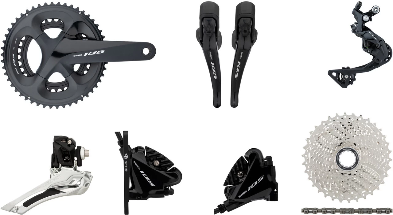 1 x Kurbelgarnitur Shimano 105 (FC-R7000)1 x Schaltwerk Shimano 105 (RD-R7000)1 x Umwerfer Shimano 105 (FD-R7000)1 x Kassette Shimano 105 (CS-R7000) oder CS-HG700-11 (11-34)1 x Kette Shimano 105 / SLX Quick-Link (CN-HG601-11)2 x Scheibenbremse Shimano 105 BR-R7070 + ST-R7020, VR und HR1 x Bremsleitung Shimano SM-BH90-JK-SS 1000 mm (VR)1 x Bremsleitung Shimano SM-BH90-JK-SS 1700 mm (HR)2 Paar Bremsbeläge Shimano1 x Scheibenbremsadapter für VR 140/160 + 160/180 mm2 x Leitungsanschlussset mit Oliven und Insertpins2 x Befestigungsschraube Typ A (für VR)2 x Befestigungsschraube für 25 mm Rahmendurchmesser (HR)1 x Kurbelschraube Shimano1 x Außenhülle Shimano OT-RS900 240 mm1 x Endkappe verlängert für Schaltwerk1 x Kassetten-Abschlussring Shimano Stahl1 x Kassetten-Spacer Shimano 1,85 mm (nur bei 11-34)1 x Kettenschloss Shimano SM-CN900-11 Quick-Link1 x Schaltzug 1800 mm1 x Schaltzug 2200 mm3 x Schaltzug-AußenhülleBremsenset montagefertig, befüllt, nach der Montage ist eine Entlüftung zu empfehlen