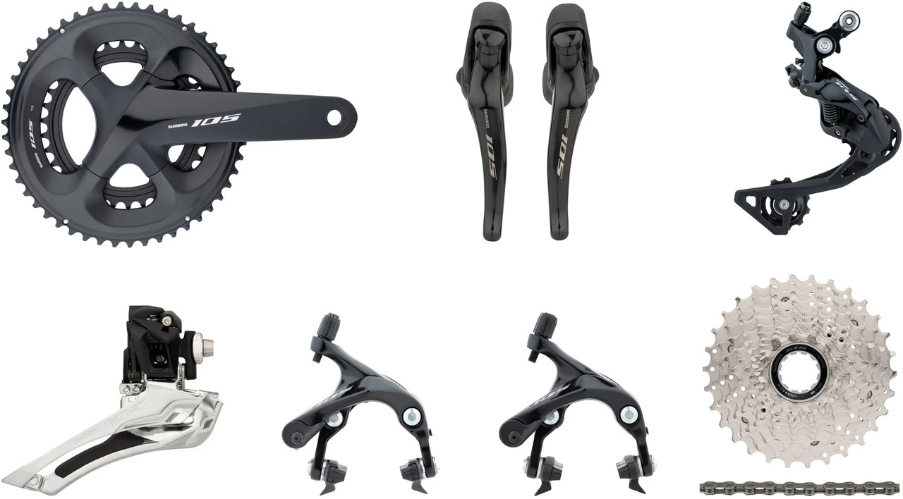 1 x Kurbelgarnitur Shimano 105 (FC-R7000)1 x Schaltwerk Shimano 105 (RD-R7000)1 x Umwerfer Shimano 105 (FD-R7000)1 Paar Schalt-/Bremsgriffe Shimano 105 STI 2-/11-fach (ST-R7000)1 Paar Felgenbremsen Shimano 105 (BR-R7000)1 x Kassette Shimano 105 (CS-R7000)1 x Kette Shimano 105 / SLX Quick-Link (CN-HG601-11)1 x Kurbelschraube Shimano1 x Außenhülle Shimano OT-RS900 240 mm1 x Endkappe verlängert für Schaltwerk1 x Schaltzug Shimano 1800 mm1 x Schaltzug Shimano 2100 mm2 x Bremszug2 x Bremszugaußenhülle3 x Schaltzugaußenhülle6 x Montage-Gelenkmutter für Felgenbremse2 Paar Bremsbeläge R55C41 x Kassetten-Abschlussring Shimano Stahl1 x Kettenschloss Shimano SM-CN900-11 Quick-Link