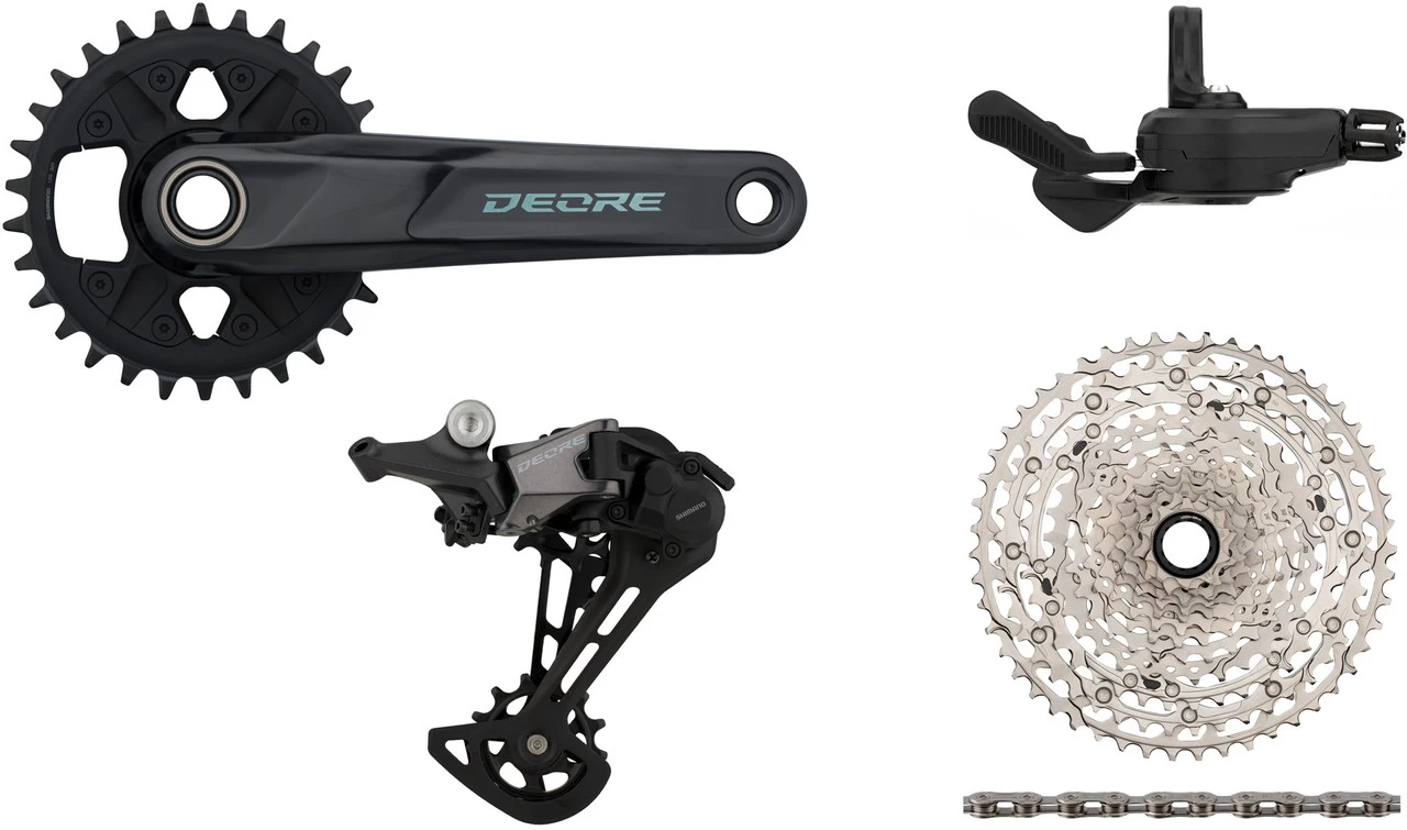 1 x Kurbelgarnitur Shimano Deore (FC-M6100-1) 30 Zähne1 x Schaltwerk Shimano Deore Shadow Plus (RD-M6100)1 x Schaltgriff Shimano Deore (SL-M6100)1 x Kassette Shimano Deore (CS-M6100-12)1 x Kette Shimano CN-M61001 x Abschlussring Shimano Stahl1 x Kettenschloss Shimano Quick-Link1 x Innenzug Shimano (2050 mm)1 x Außenhülle Shimano (1880 mm)3 x Endkappe 6 mm gedichtet1 x Endkappe verlängert