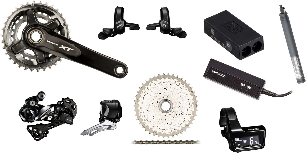 1 x Kurbelgarnitur Shimano XT (FC-M8000)1 x Schaltwerk Shimano XT Di2 Shadow Plus (RD-M8050)1 x Umwerfer Shimano XT Di2 (FD-M8070)2 x Schalter Shimano XT Di2 (SW-M8050), rechts und links1 x Akku Shimano Di2 (BT-DN110)1 x Ladegerät Shimano Di2 (SM-BCR2)1 x Verteilerdose Shimano SM-JC41 intern1 x Elektrischer Verteiler Shimano 3 Port (SM-EW90-A, nur bei Version ohne Display)1 x Drahtlos-Einheit Shimano (EW-WU101, nur bei Version ohne Display)1 x Systeminformations-Display Shimano Di2 SC-MT800 (nur bei Version mit Display)1 x Kassette Shimano XT (CS-M8000)1 x Kette Shimano Ultegra / XT Quick-Link (CN-HG701-11)1 x Kurbelschraube Shimano1 x Steckerwerkzeug Shimano TL-EW021 x Ladekabel Shimano USB Y-7FJ000201 x Befestigungsmaterial für EW-WU101 (nur bei Version ohne Display)2 x Lenkerschellen-Adapter (nur bei Version mit Display)1 x Kassetten-Abschlussring Shimano Aluminium1 x Kettenschloss Shimano SM-CN900-11 Quick-Link