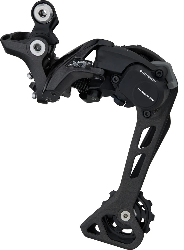 Das Shimano XT RD-M8000 Schaltwerk verfügt über einen Shadow-Plus-Mechanismus, mit dem zwischen maximaler Kettenstabilität und minimalen Bedienkräften umgestellt werden kann. Auch das extrem niedrige Profil und der flache Anstellwinkel kommen der Sicherheit auf schwierigen, schmalen Trails zugute. Außerdem weiß das RD-M8000 im Vergleich zu seinen Vorgängern mit einer schräg laufenden Kette besser umzugehen und verfügt über größere Schalträdchenzähne für noch reibungslosere Schaltleistung. Im Dyna-Sys11-System versieht es somit effizient und dauerhaft seinen Dienst. Beide Käfige des Schaltwerks bestehen aus leichtem Aluminium. In der kürzeren Version (GS) ist es mit 1×11- und 2×11-fach Schaltungen und Kassetten bis 46 bzw. 42 Zähne kompatibel. In der langen Version (SGS) kann es auch für 3×11-fach Antriebe mit einer 11-40 Kassette verwendet werden.