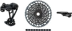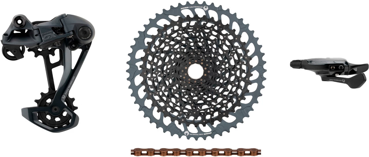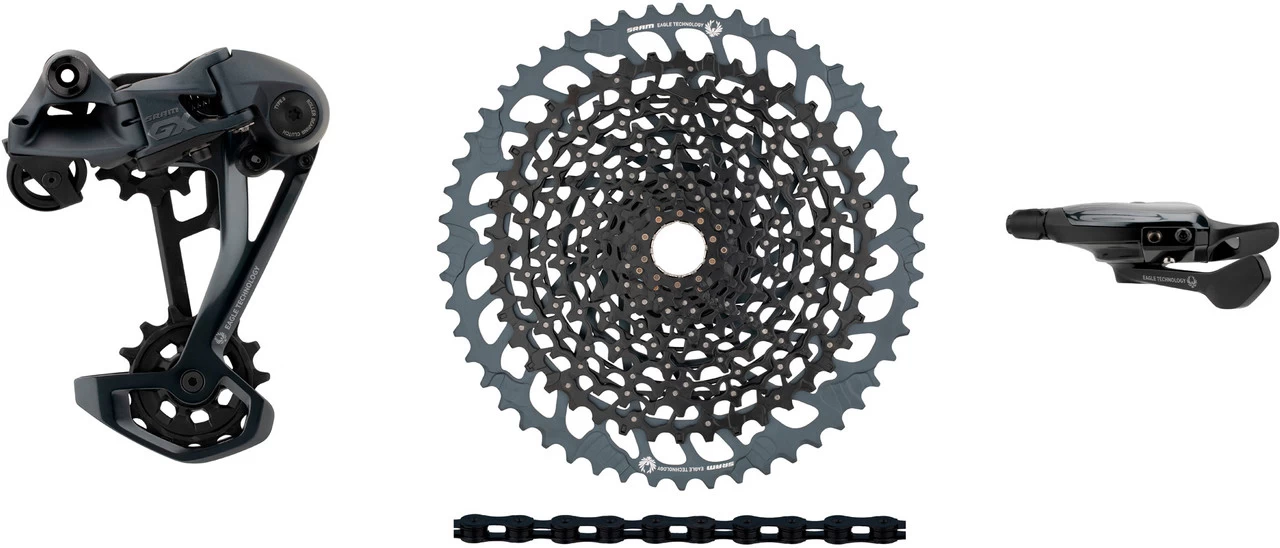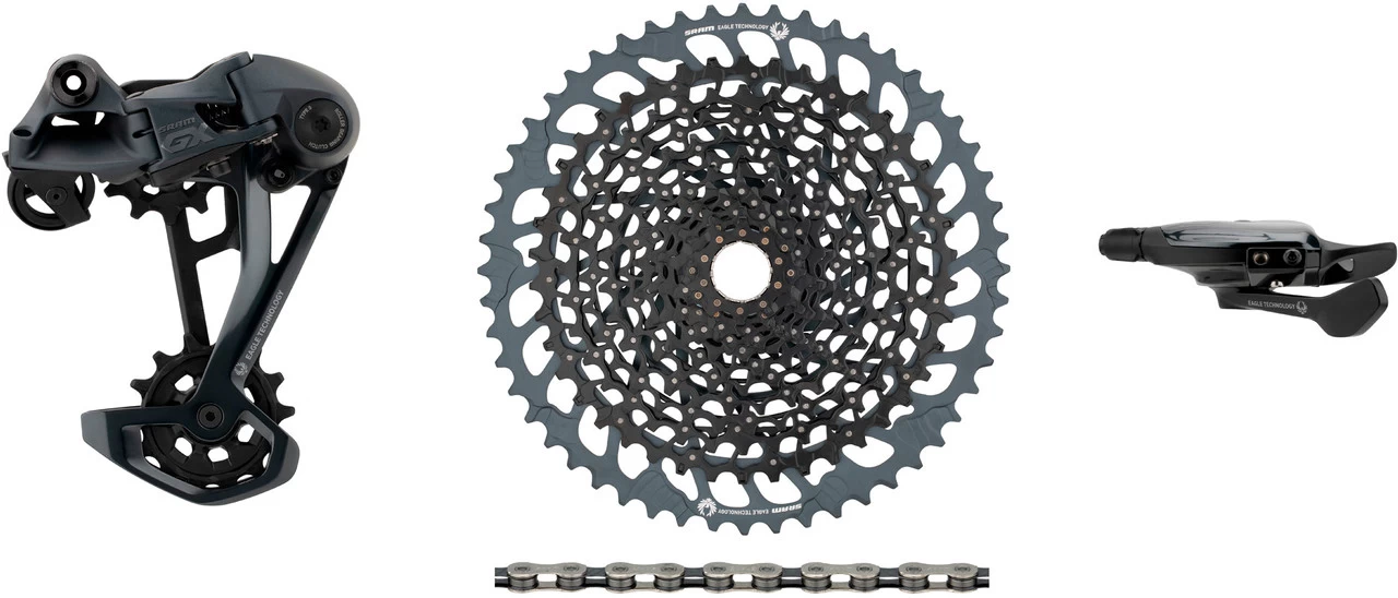 Dieses SRAM Upgrade-Kit der Serie GX Eagle ist für 1×12-fach-Antriebe an E-Bikes im Gelände konzipiert und kommt direkt mit Kassette. Es setzt sich zusammen aus einem GX Eagle Schaltwerk, einem spezifischem GX Eagle Trigger Single Click Schaltgriff für E-MTBs, einer XG-1275 Kassette sowie einer PC XX1 Eagle oder PC GX Eagle Kette.